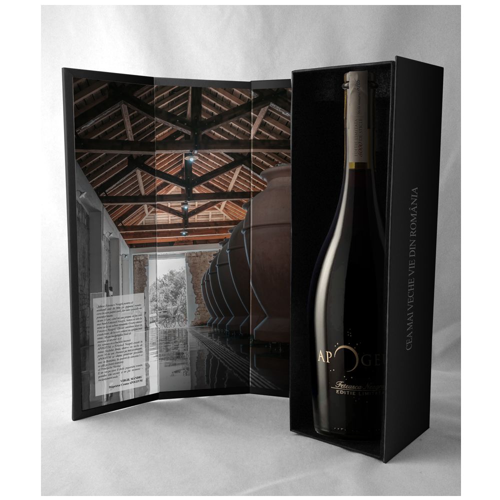 Descopera Apogeum , unul dintre cele mai rafinate si exclusiviste vinuri romanesti, o Feteasca Neagra autentica, obtinuta dintr-o vie veche de peste 50 de ani, situata in renumita zona viticola Dealu Mare. Creat cu pasiune si dedicare, acest vin este rezultatul unei viziuni ambitioase de a pune in valoare un soi autohton exceptional, printr-un proces unic de vinificatie in amfore de ceramica.
