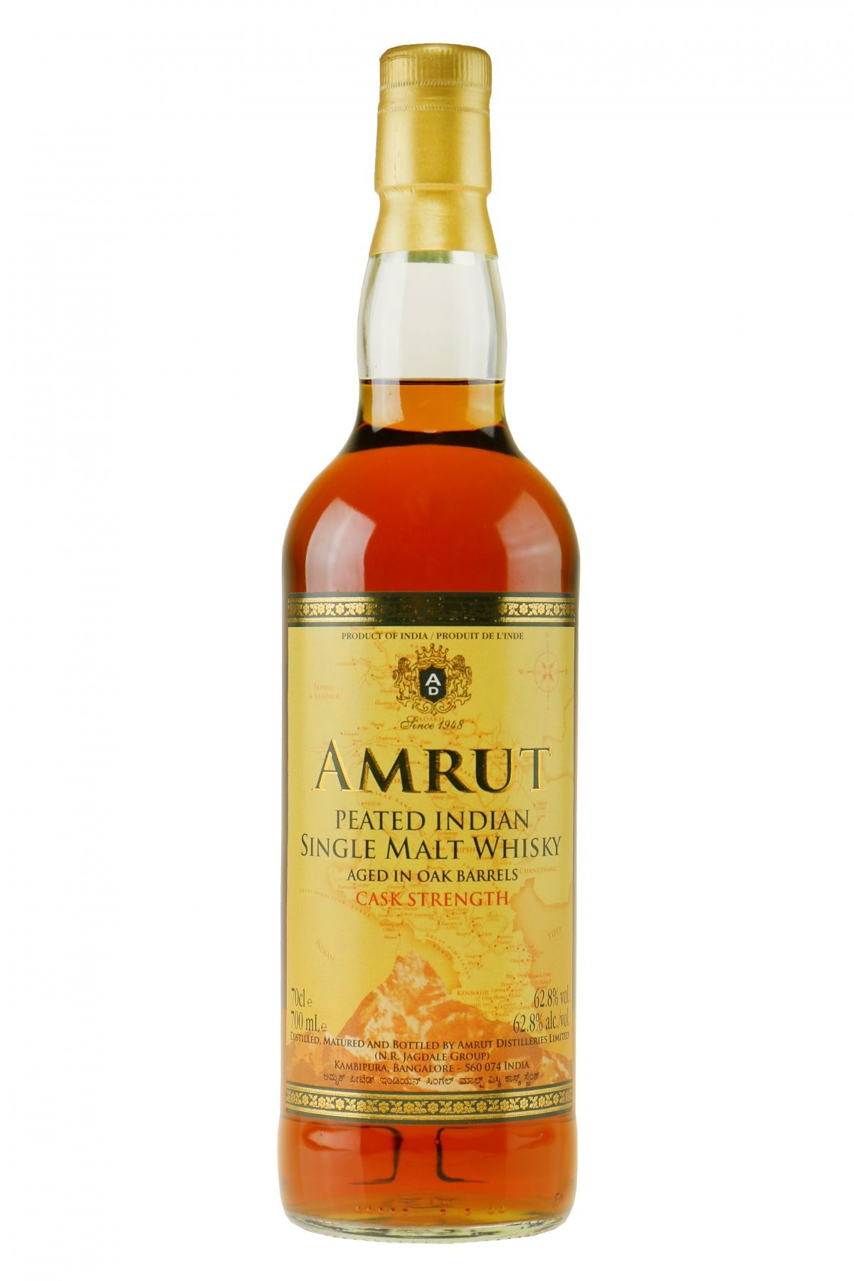 Amrut Peated Indian Single Malt, este un whisky care îmbină tradiția și inovația, într-o călătorie aromată din inima Indiei. Cu o tărie de 46% alcool, acest single malt vine cu note bogate de turbă și caise, maturate atent în butoaie de stejar american. Turba scoțiană, folosită în procesul de afumare, aduce o amprentă unică, oferind un buchet sofisticat și memorabil. Distileria Amrut reușește să transforme fiecare pahar într-o experiență senzorială desăvârșită, iar aromele sale încântătoare cuceresc iubitorii de whisky din întreaga lume.