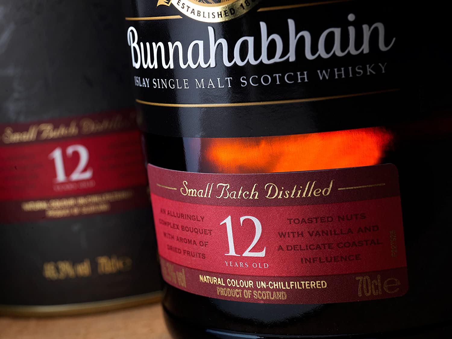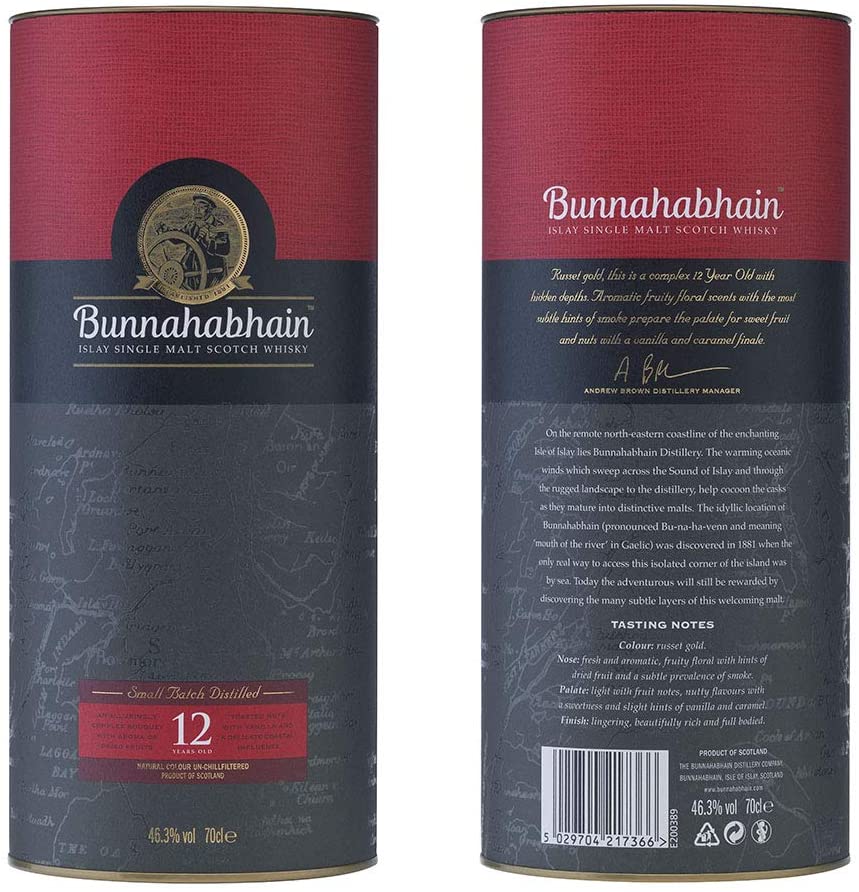 Distileria Bunnahabhain îşi deschide porţile în anul 1881 şi începe timid producţia de whisky premium, specific zonei Islay. Sortimentele sunt şi acum obţinute tradiţional din orz malţat, apă pură extrasă din izvorul Margadale şi un pic de ferment. Single malt-ul a fost relansat în anul 2010 cu o formă diferită de prezentare, pentru a introduce noua abordare, unde sortimentul nu este filtrat la rece. Bunnahabhain 12 ani este un whisky complex, cu personalitate, care nu are nevoie de prea multe prezentări, deoarece, spun producătorii, calităţile sale vorbesc de la sine.