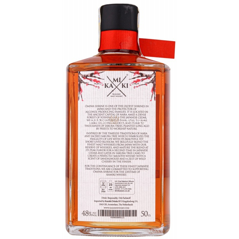 Kamiki Sakura este un blended malt floral-lemnos cu totul special, care îşi concentrează esenţa în jurul celor mai fine whisky-uri japoneze şi îşi şlefuieşte identitatea cu totul aparte printr-o dublă maturare finală. Cele două perioade de maturare finală nu se înscriu nicidecum în familiar, fiind vorba despre învechirea în butoaie de cedru japonez (yoshino sugi) şi apoi în butoaie de cireş japonez. Nu întâmplător aromele ample dezvăluite de Kamiki Sakura în degustare sunt pe cât de suave, pe atât de impunătoare, secretele distilării atingând de-a lungul timpului rangul de artă în Nara, capitala spirituală a Japoniei ce stă străjuită de temple antice. Aici, la umbra lor, aromele fine de cedru şi de cireş calmează mintea şi trupul de secole, iar acum, aceleaşi arome splendide călătoresc mări şi ţări pentru a aduce o picătură din misticismul antic japonez în fiecare colţ de lume.