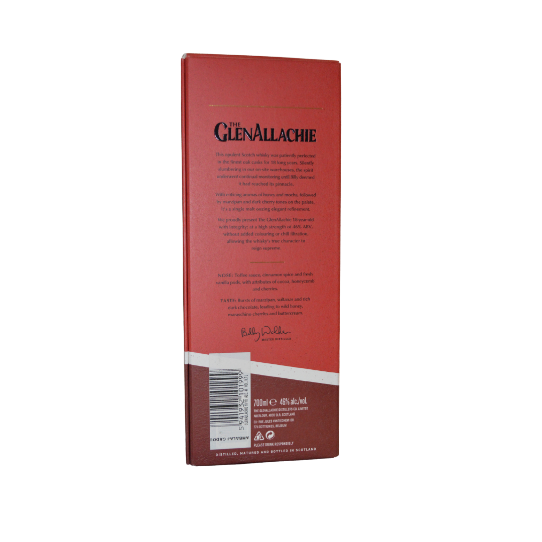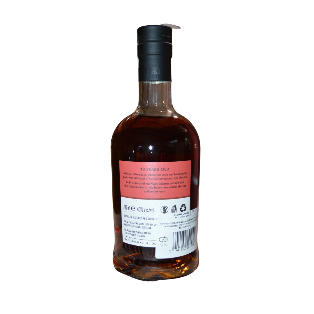 GlenAllachie Single Malt, 18 Ani, este un whisky rafinat, maturat timp de 18 ani în cele mai bune butoaie de stejar. Creat sub supravegherea maestrului Billy Walker, acest whisky își păstrează integritatea fiind îmbuteliat la 46%, fără filtrare la rece și fără coloranți adăugați. Aroma sa bogată și complexă de marțipan, ciocolată neagră și cireșe negre se împletește cu tonuri de miere și cacao, oferind o experiență gustativă deosebită.